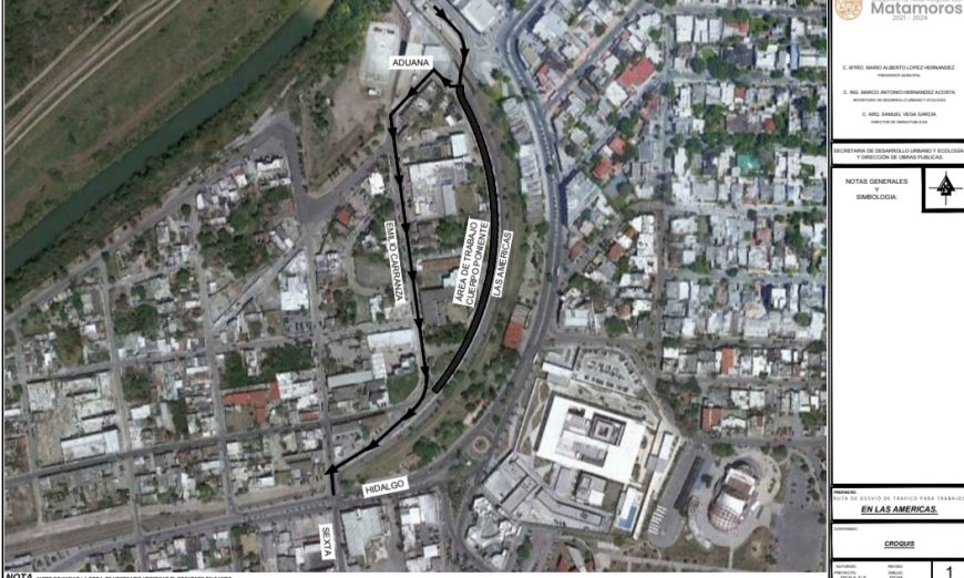 A todas las personas que cruzan de Brownsville, Texas a Matamoros por el Puente Internacional B&M, conocido como Puente Viejo, el Gobierno Municipal les informa que debido a la realización de trabajos en la Avenida Las Américas, el carril poniente será cerrado a la circulación, ofreciendo como alternativa circular por la calle Emilio Carranza.