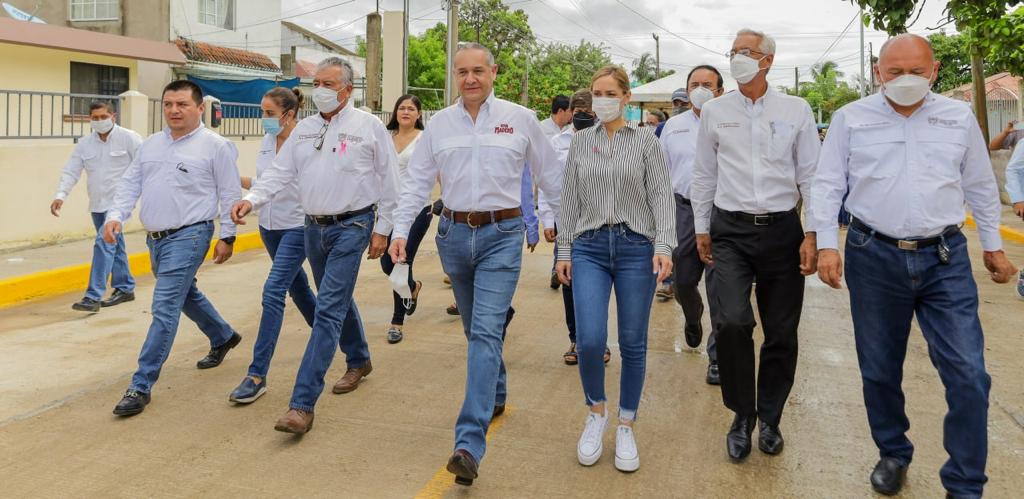 Ejemplo de ello es la calle Josefa Ortiz de Domínguez, donde este jueves el alcalde acudió junto a su esposa, la Sra. Ana Cristina Organista de Oseguera, presidenta del DIF Madero, para entregar la pavimentación a base de concreto hidráulico y obras complementarias, beneficiando directamente a 218 vecinos de la colonia Revolución Verde.