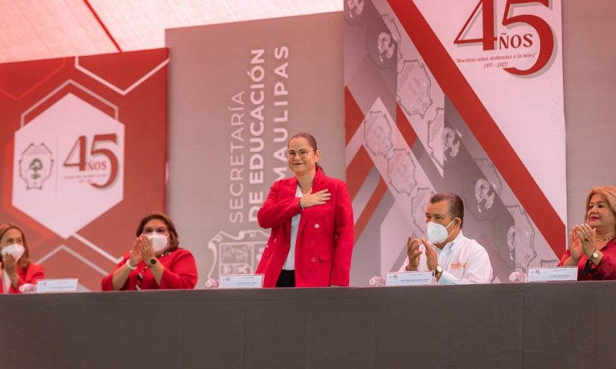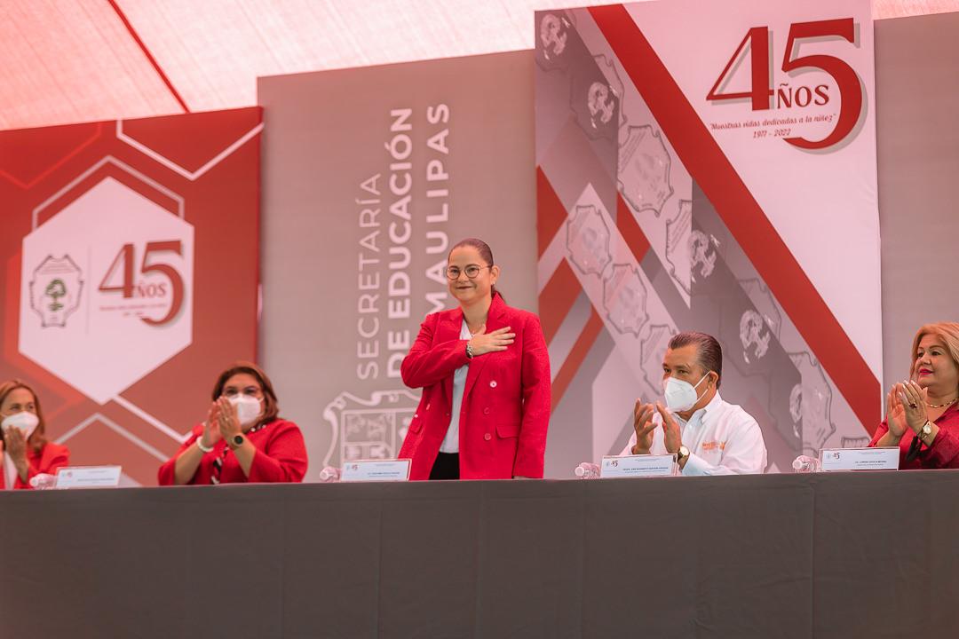 Ciudad Victoria, Tamaulipas.- Con la representación del Gobernador Américo Villarreal Anaya, la Secretaria de Educación en Tamaulipas, Lucía Aimé Castillo Pastor presidió la ceremonia para celebrar el 45 aniversario de la Escuela Normal Federal de Educadoras “Maestra Estefanía Castañeda”, en donde reiteró el compromiso del Jefe del Ejecutivo Estatal para transformar el sistema educativo de la entidad.