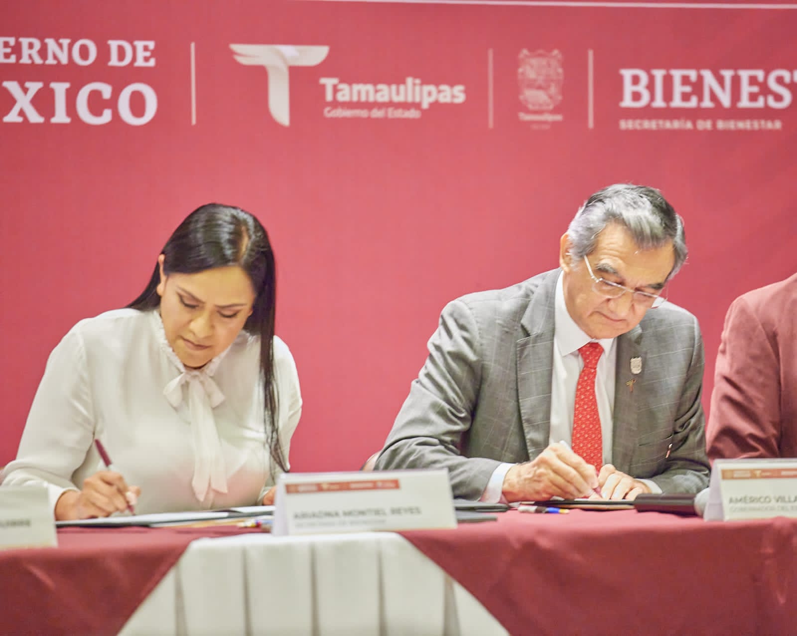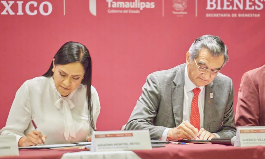 Ciudad Victoria, Tamaulipas.- El gobernador Américo Villarreal Anaya firmó hoy con la secretaria de Bienestar federal Ariadna Montiel Reyes, el convenio que permite incorporar a más de 28 mil tamaulipecas y tamaulipecos al programa «Pensión para el Bienestar de las Personas con Discapacidad», dando cumplimiento al compromiso adquirido con este grupo vulnerable de la población.