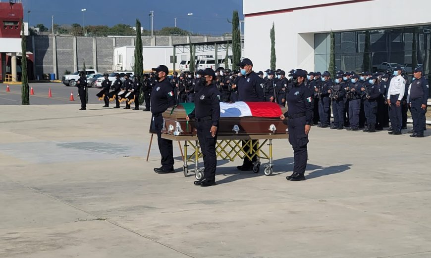 La ceremonia contó con la presencia de sus familiares y personal de la Secretaría de Seguridad Pública, quienes realizaron los honores de ordenanza y colocación del lábaro patrio sobre el ataúd.