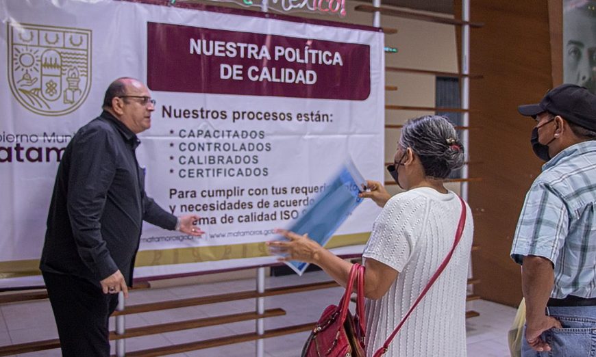 En el marco de los trabajos que se realizan rumbo a la certificación ISO 9001:2015 por parte del Gobierno de Matamoros, fue instalada en la planta baja de la Presidencia Municipal una mampara, que tiene como propósito que los ciudadanos que visiten el Ayuntamiento para realizar diversos trámites conozcan la política de calidad.