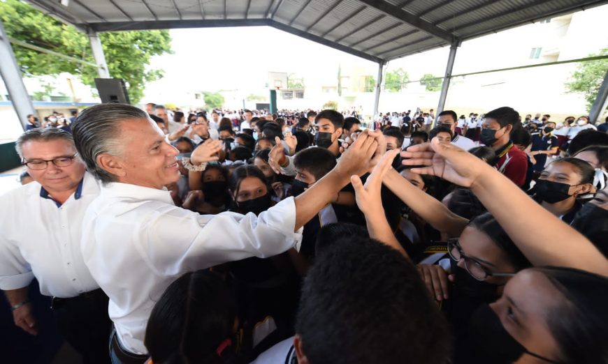 Luego de encabezar, este lunes, la ceremonia de honores a los símbolos patrios en la Escuela secundaria General número 7, «Profr. Francisco Medina Cedillo» de la colonia Unidad Modelo, el Presidente municipal Chucho Nader reiteró el compromiso de su administración por seguir impulsando el mejoramiento y la modernización de la infraestructura escolar en el municipio.