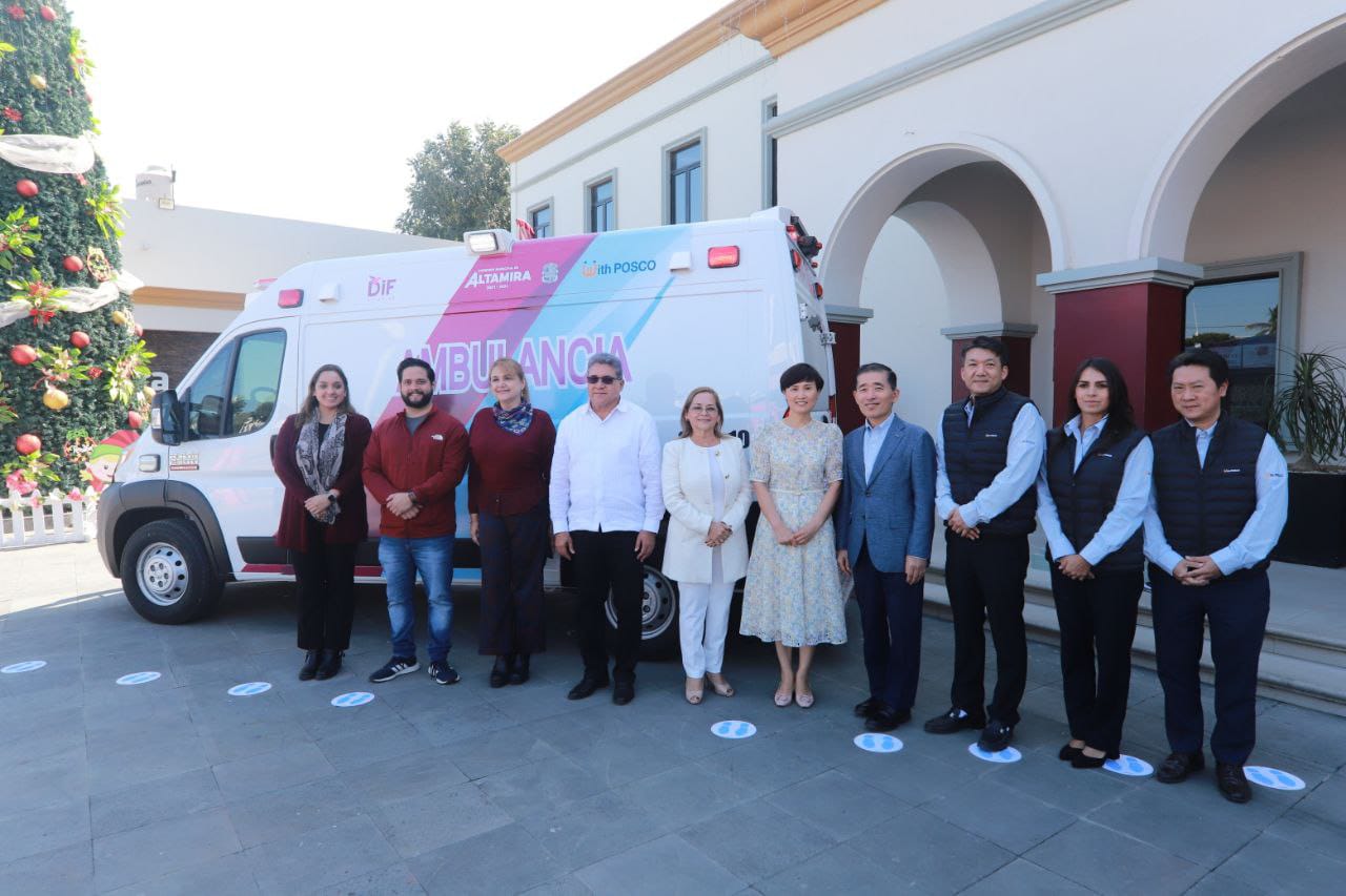 Altamira, Tamaulipas.- La mañana de este martes, en la explanada de la presidencia municipal de Altamira fue llevada a cabo una destacada ceremonia de entrega de una ambulancia último modelo por parte de la empresa de capital coreana Posco al Sistema DIF Altamira, misma que se suma al parque vehicular de 6 ambulancias con las que ya cuenta el organismo.
