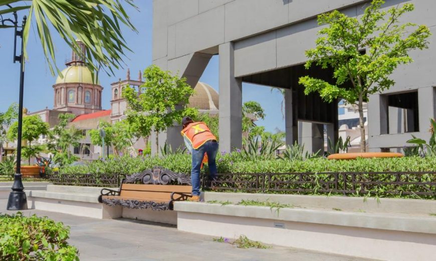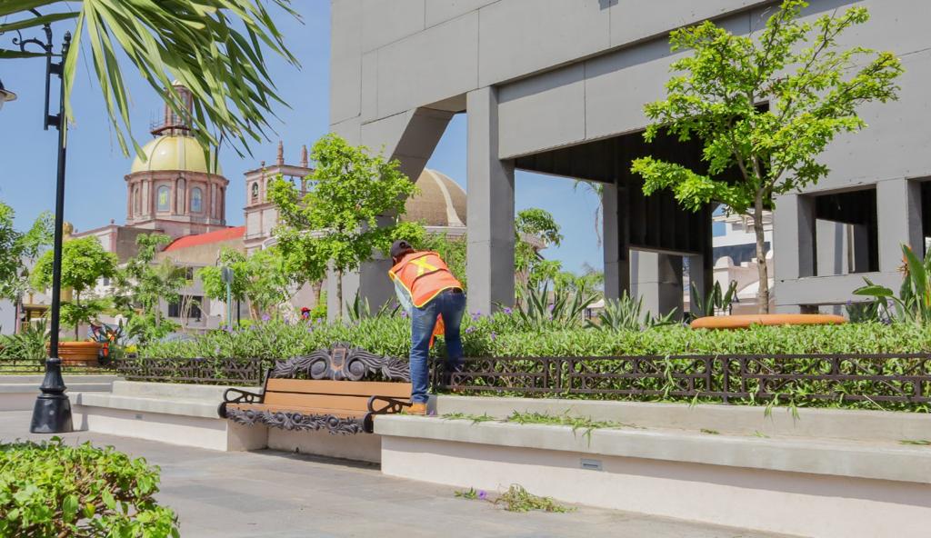 Cuadrillas de la Dirección de Servicios Públicos reforzaron las labores de mantenimiento en espacios icónicos de la ciudad, como es la Plaza Isauro Alfaro Otero, donde es una tradición ver concentradas decenas de familias maderenses.