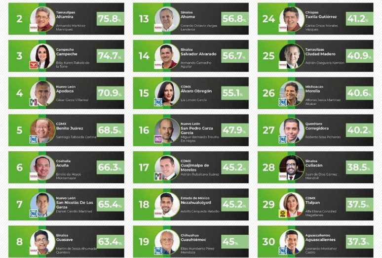 Con base a los resultados de la última encuesta nacional correspondiente al mes de agosto de 2022, sobre las condiciones de gobierno en México, realizada en las 32 entidades, elaborada por la casa encuestadora Arias Consultores, el alcalde altamirense registra el 75.8 por ciento de aprobación a su trabajo, posicionándose con ello, en el segundo sitio a nivel nacional (100 alcaldes evaluados) y el primero en el Estado de Tamaulipas.