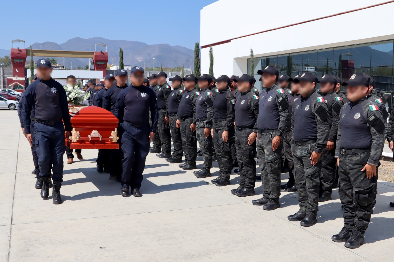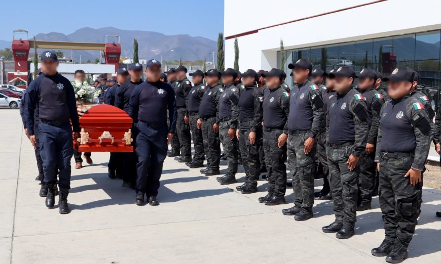 Tras un minuto de silencio, una salva de honor y el toque de silencio interpretado por la Banda de Guerra de la Guardia Estatal, se procedió al cortejo fúnebre para acompañar al elemento fallecido en funciones de alto impacto, asimismo, el titular de la SSPT refrendó el compromiso de la actual administración de no desamparar a sus familiares.