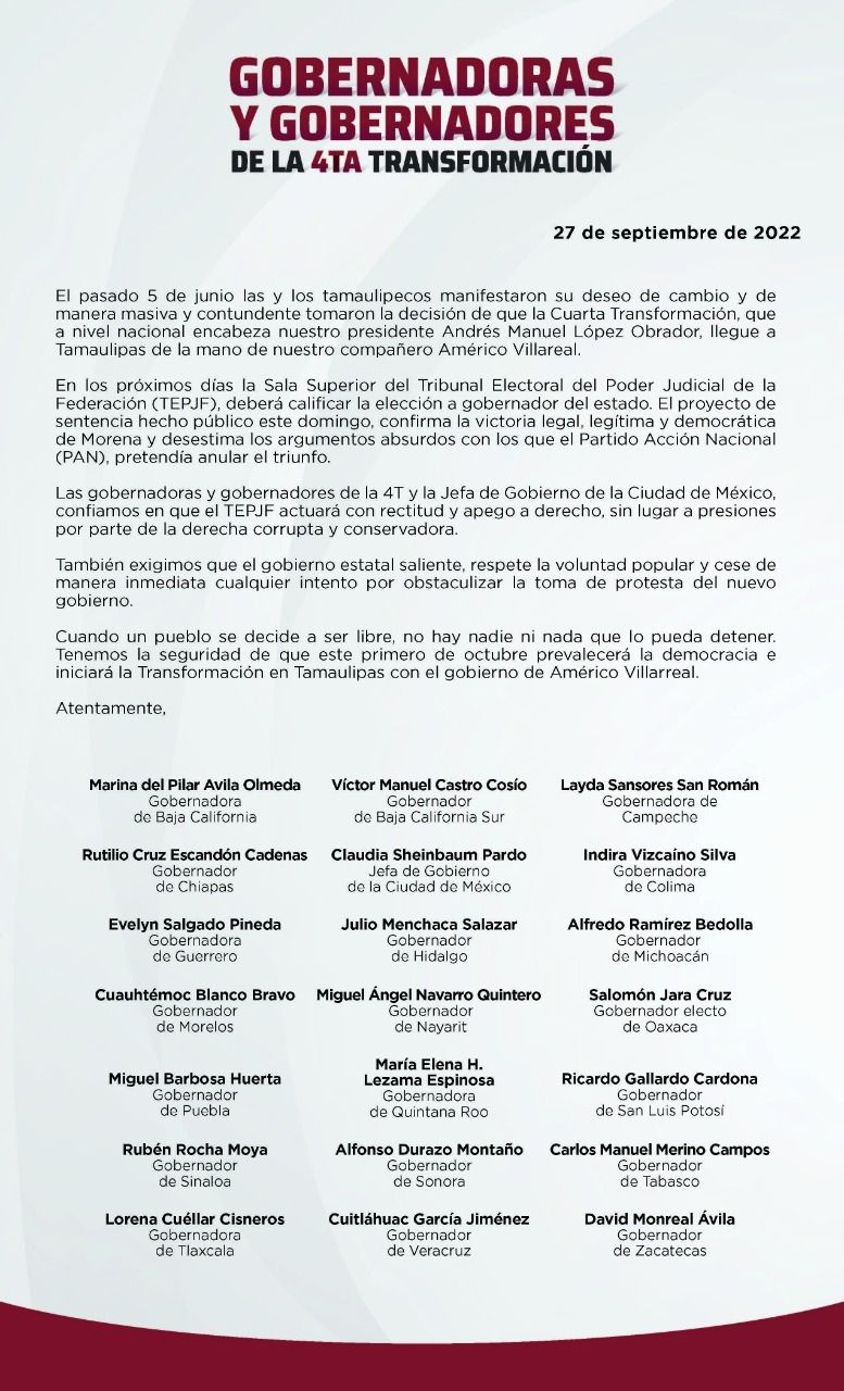 También respaldan al doctor Américo Villarreal, Rubén Rocha Moya Gobernador de Sinaloa; Carlos Manuel Merino Campos Gobernador de Tabasco; Alfonso Durazo Montaño Gobernador de Sonora; Lorena Cuéllar Cisneros Gobernadora de Tlaxcala; Cuitláhuac García Jiménez Gobernador de Veracruz, y David Monreal Ávila Gobernador de Zacatecas.