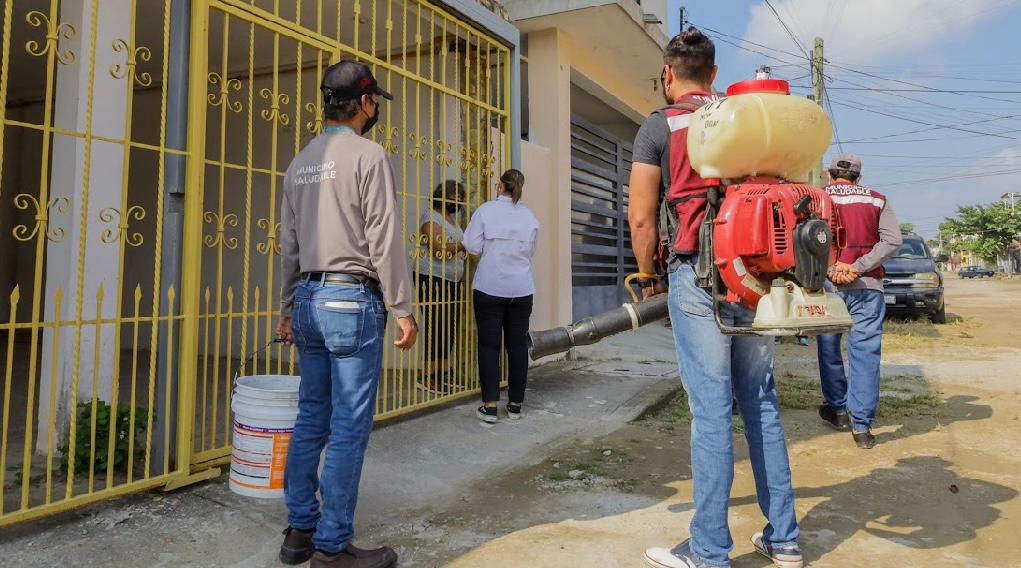 Al mando de dichas cuadrillas, se encontró Tatiana Ojeda Caballero, directora de la dependencia en mención quien en coordinación con autoridades de Salud y solicitud expresa del alcalde Adrián Oseguera Kernion, ha intensificado la labor de fumigación para mitigar las enfermedades por vector.