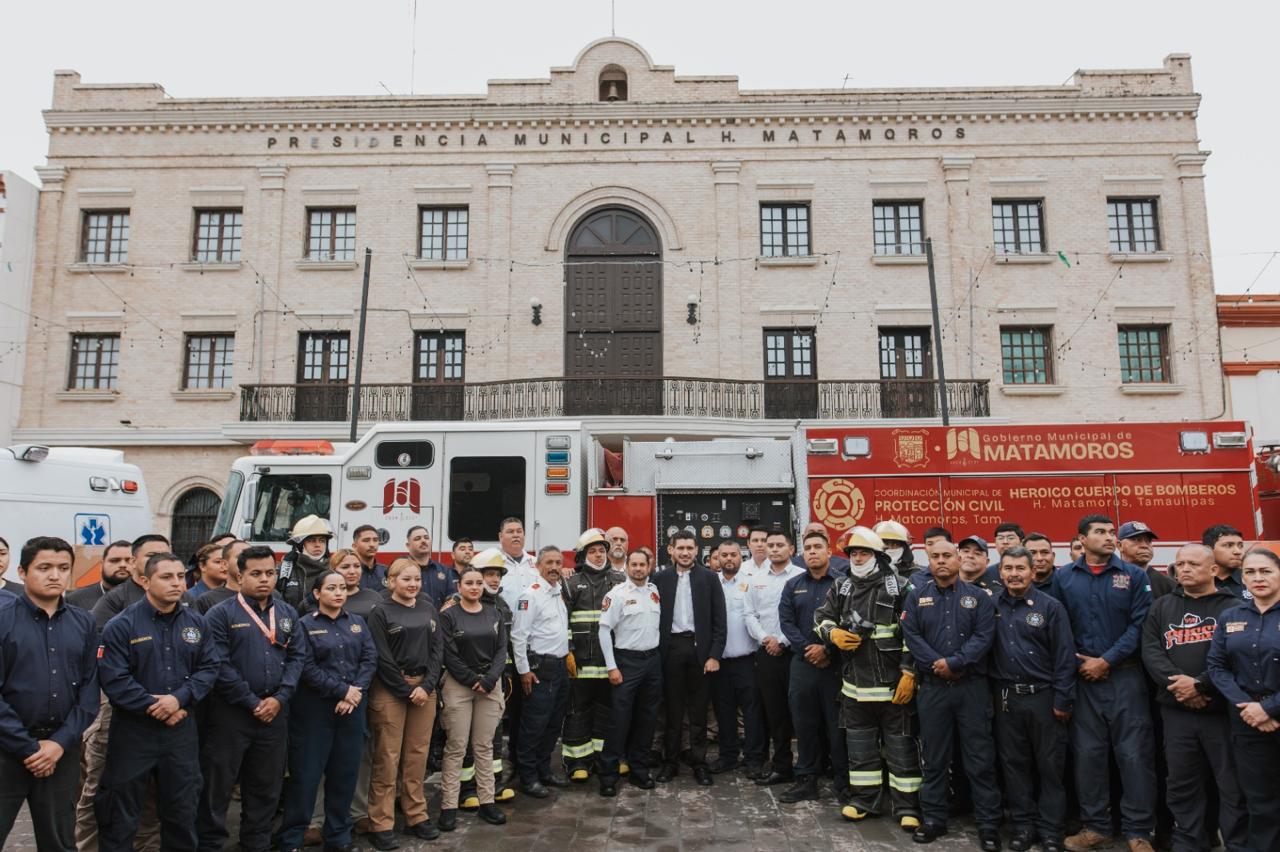 H. Matamoros, Tamaulipas.- El alcalde Beto Granados, en un acto de justicia para el Heroico Cuerpo de Bomberos, hizo entrega de equipo personal, cuatro unidades motobomba y una ambulancia donada por la empresa Orbia, que en conjunto suman más de 8 millones de pesos. Además, anunció un incremento salarial del 30 por ciento para todo el personal de Protección Civil.